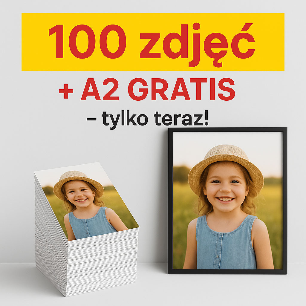 Zamów wydruk 100 odbitek w formacie 10x15 cm, a otrzymasz 1 duże zdjęcie w formacie A2 (40x60 cm) zupełnie za darmo!To świetna okazja, aby zachować swoje wspomnienia w wyjątkowej jakości i ozdobić wnętrze dużą fotografią.